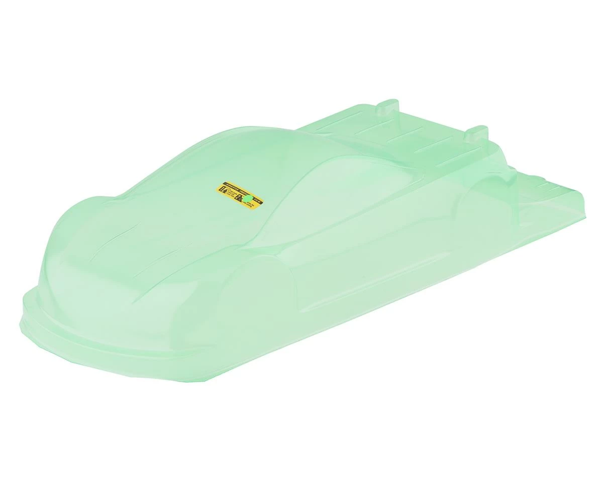 The rear section of this body has plenty of deck overhang. This rear overhang is a very important part of the body which controls down-force and provides the placement for the rear wing. A small built-in spoiler is located at the tail end of the body to help stabilize the car at high-speed. To complete the look the bubbled roof profile and minimally structured greenhouse area allows the body to blast through high-speed sections.