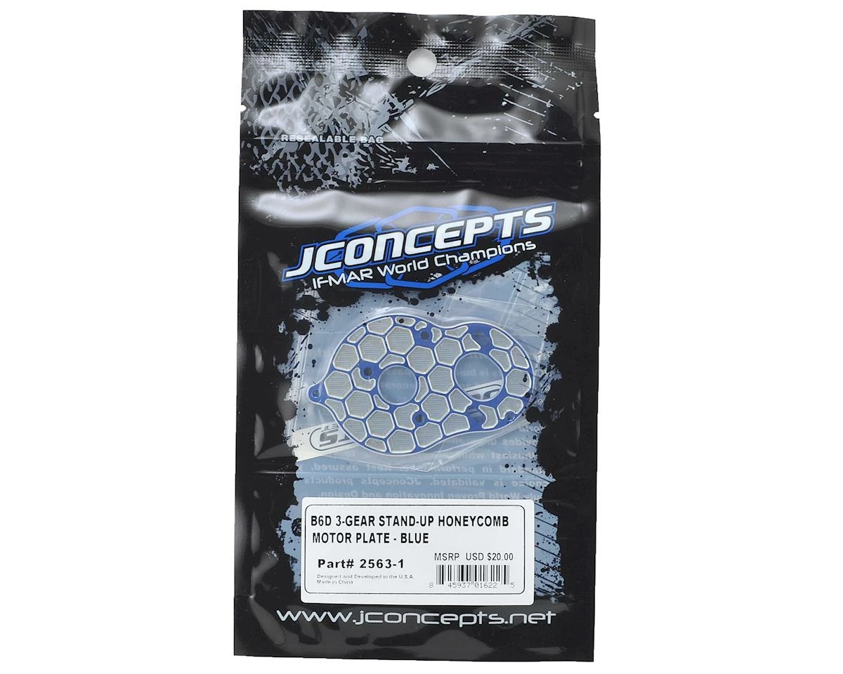The JConcepts Associated B6 ‘Honeycomb’ 3 Gear Standup Motor Plate incorporates a honeycomb milling pattern with placement more suited to surrounding geometry making the plate light-weight and very rigid in multiple directions. The honeycomb features add a 3D look especially as they remain natural aluminum while the rest is available blue or black anodized colors. Slight chamfering on the 3mm thickness material allows the rather beefy plate to look quite slim and trim.