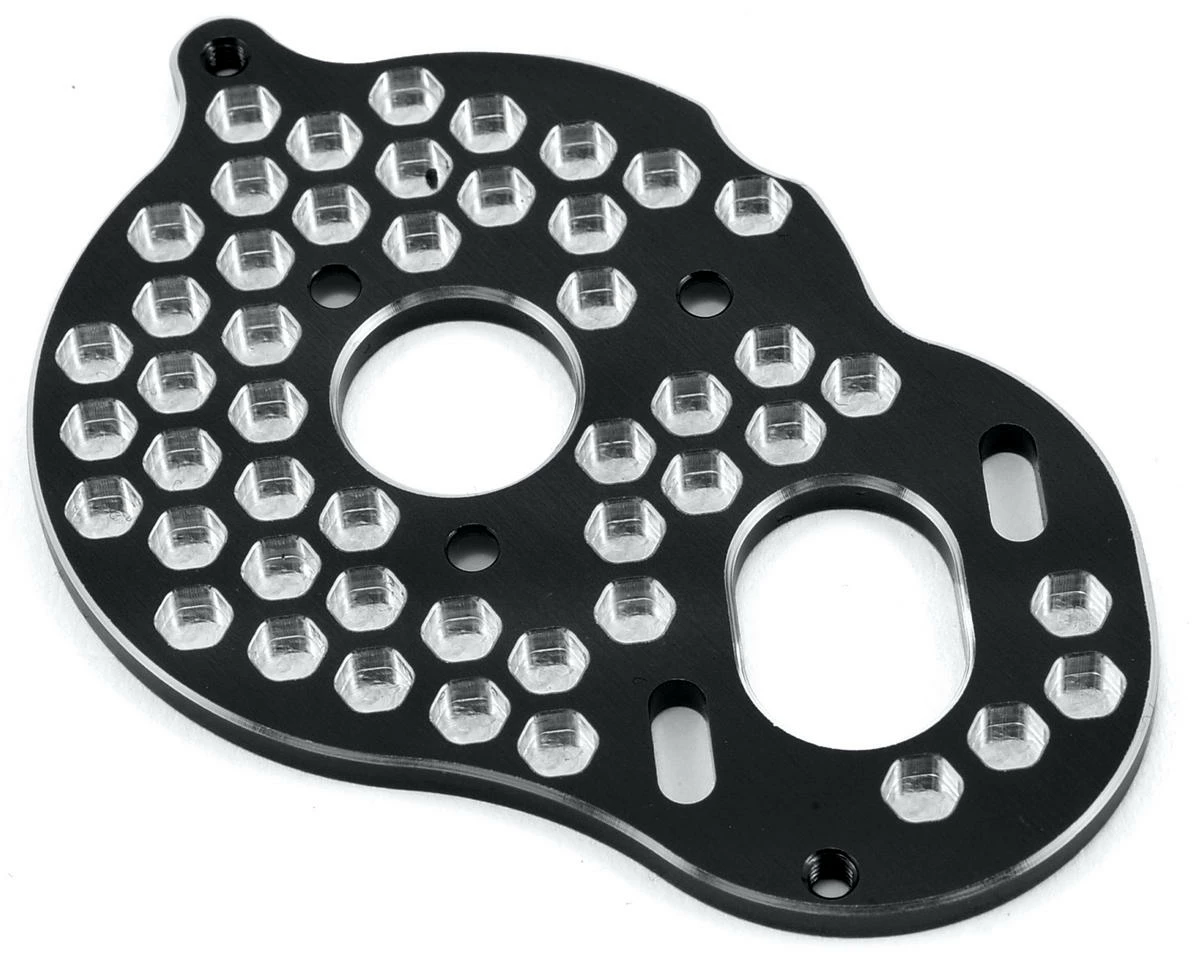 This is an optional JConcepts Aluminum B5M “3 Gear” Honeycomb Motor Plate. JConcepts has created a sweet looking upgrade motor plate for the popular 3-gear transmission upgrade available for the B5M, T5M and SC5M vehicles. The design team at JC have incorporated a honeycomb milling affect with placement more suited to surrounding geometry making the plate lightweight and very rigid in multiple directions. The honeycomb features add a 3D look especially as they remain natural aluminum while the rest is available black or blue in color. Slight chamfering on the 3mm thickness material allows the rather beefy plate to look quite skinny.