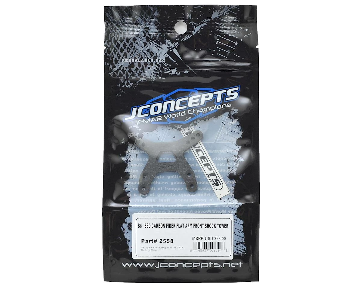 The JConcepts B6 Carbon Fiber “Flat Arm” Front Shock Tower is 4mm thick, durable, light-weight and features the JConcepts milled sections which help maintain strength while minimizing weight. The 3 standard shock positions remain for quick and steady adjustments in the correct position for the flat arm front shock geometry. The tower features the JConcepts treatment of a milled logo and identification for suspension arm type. The tower is complete with countersunk holes on the top surface to accept the stock mounting hardware.