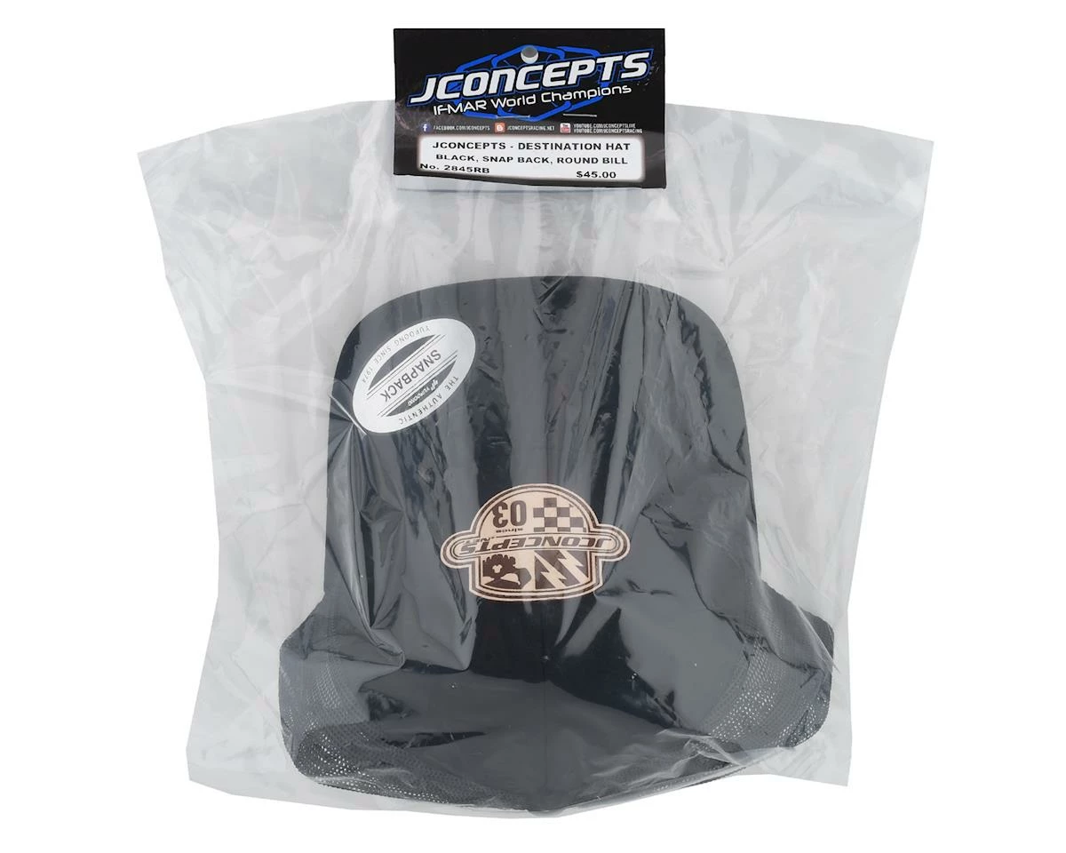 The JConcepts Black Destination Hat Snapback Round Bill Hat is a redesigned piece if JCon apparel that reps the latest shield racing logo on a cut leather patch. The โsince 03โ authorized, lightning bolt and checkerboard design represents the finish line and gives any enthusiast the style and class expected of professional drivers while celebrating JConcepts enduring legacy. This snap-back hat is adjustable, with one size fitting most. Available in flat or rounded bill style.ย