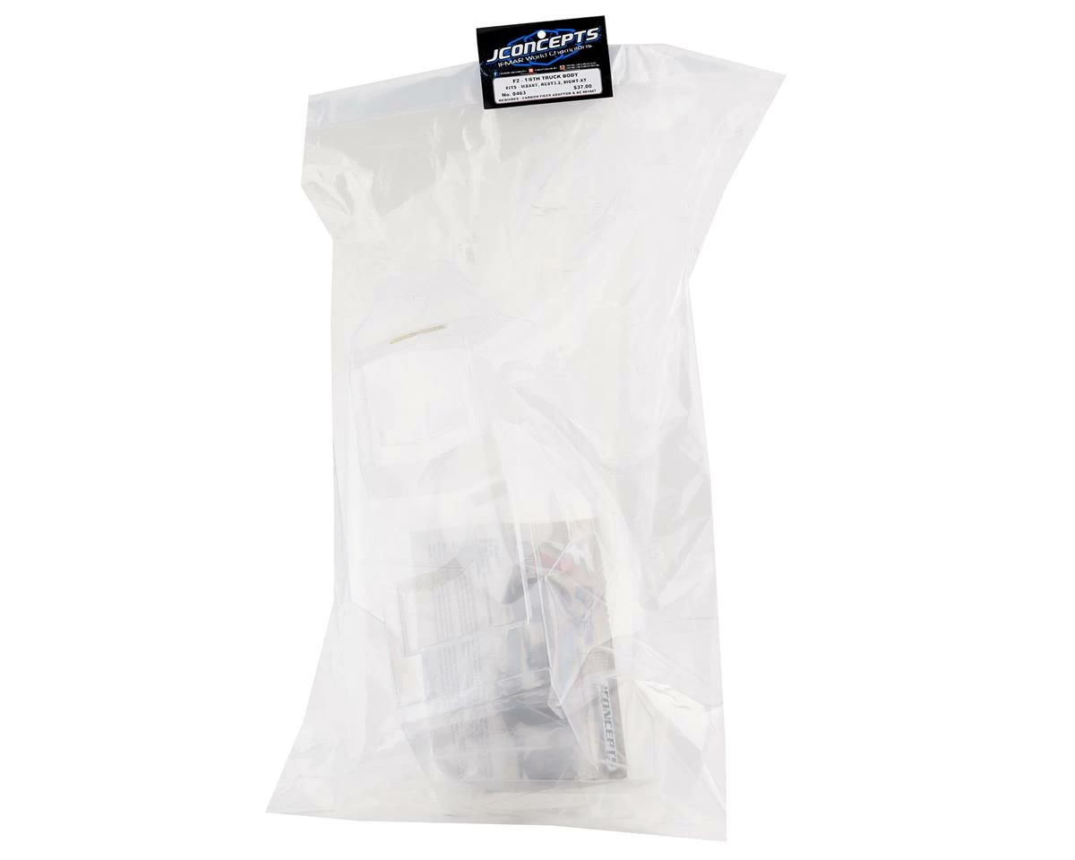 The JConceptsย F2 1/8 Truggy Body is a great option for those wanting great performance and style. This polycarbonate body shell comes clear to add your own custom paint scheme. Featuring a raised nose off the shock towers to provide a better looks and aerodynamics. A narrow shape, double upper railed cab and inner louvers are carried are used to keep with existing truggy styling. To finish the look, this body gets a recessed bed area leading to a spoiler outlet in the bed near the mounting area. JConcepts has taken the next step in design by creating one body that that fits a variety of chassis using a separate body mounts (sold separately) for that specific vehicle.
