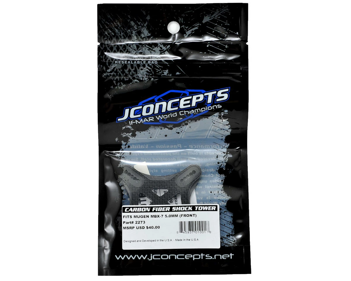 This is an optional Jconcepts MBX7 5.0mm Carbon Fiber Front Shock Tower. The JConcepts team went to work in the design lab, with a goal to better outfit and shed some weight from the World Champion Mugen MBX7. The design team has pin-pointed the exact geometry locations of the stock front shock tower, and developed a durable and lightweight option part that is a direct bolt-on for the popular Mugen buggy. The front shock tower is 5mm thick and features all the stock mounting geometry in a more compact package. Reinforcement ribs have been added where needed for additional strength.