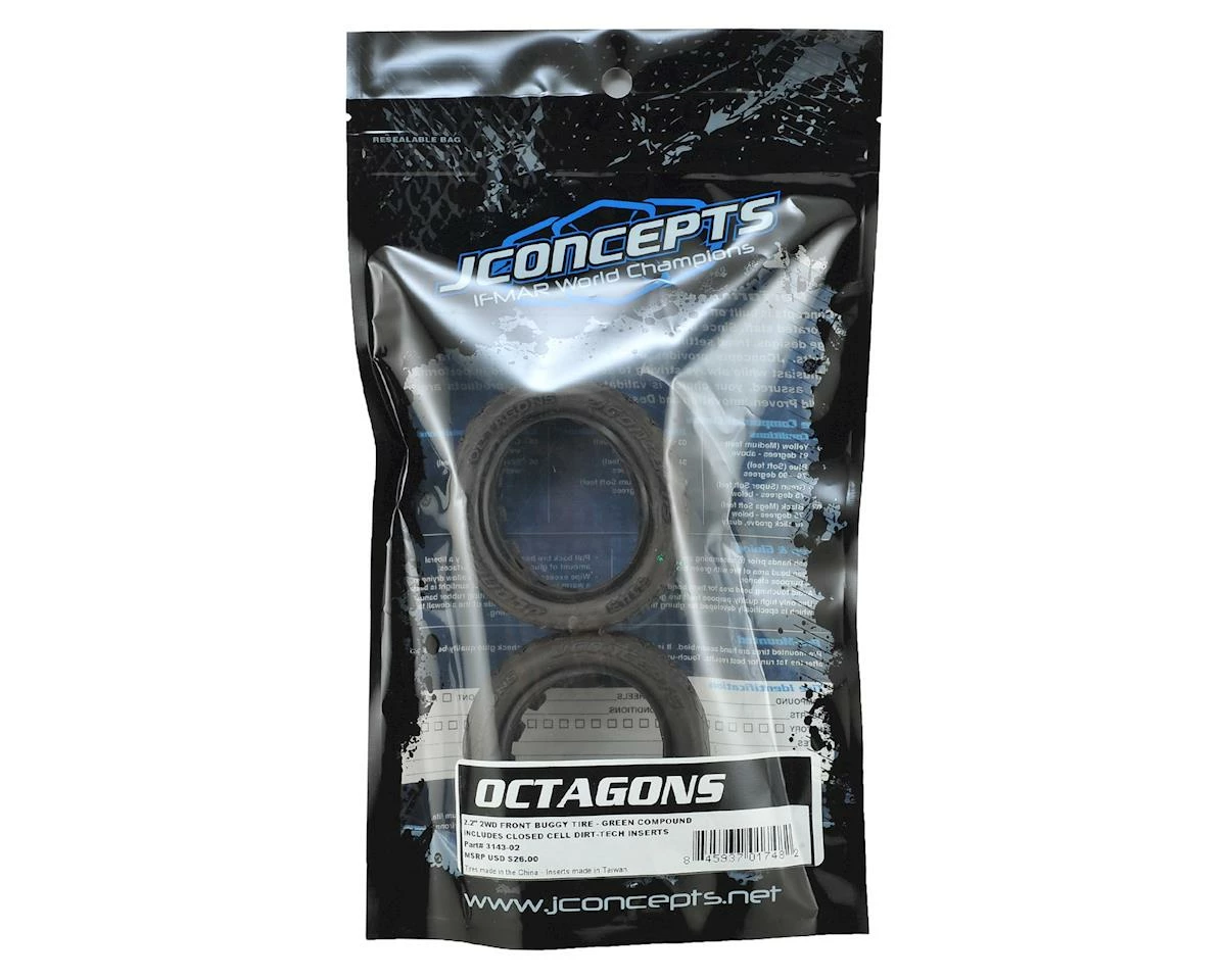 JConcepts Octagons 2.2″ 2WD Front Buggy Tires are a great choice when track conditions require a tire with less tread, but more tread than a full slick tire. The beauty of the Octagons lay just beneath the surface where JConcepts has removed a little surface area in the geometry based pattern.