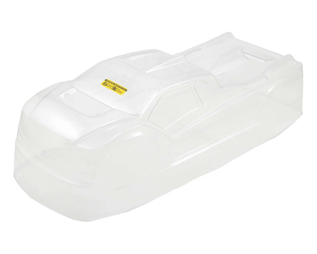 This is the JConcepts “Finnisher” Illuzion Clear Truggy Body for the Team Associated RC8T3 and RC8T3e. This Finnisher body incorporates pre-dimpled locations for one of the hottest truggies on the circuit. The slight cab forward, raked windshield and aggressive stance highlight a performance oriented core. A wide front hood scoop allows plenty of clearance for the unique RC8T3 shock geometry. The body incorporates a large center fin which begins on the roof line and finishes just past the half-way point on the bed. Extended front chin spoiler, headlight and grill protect the front-end from unwanted up-drafts during flight while the supplied decals stand-out like an 18 wheeler.