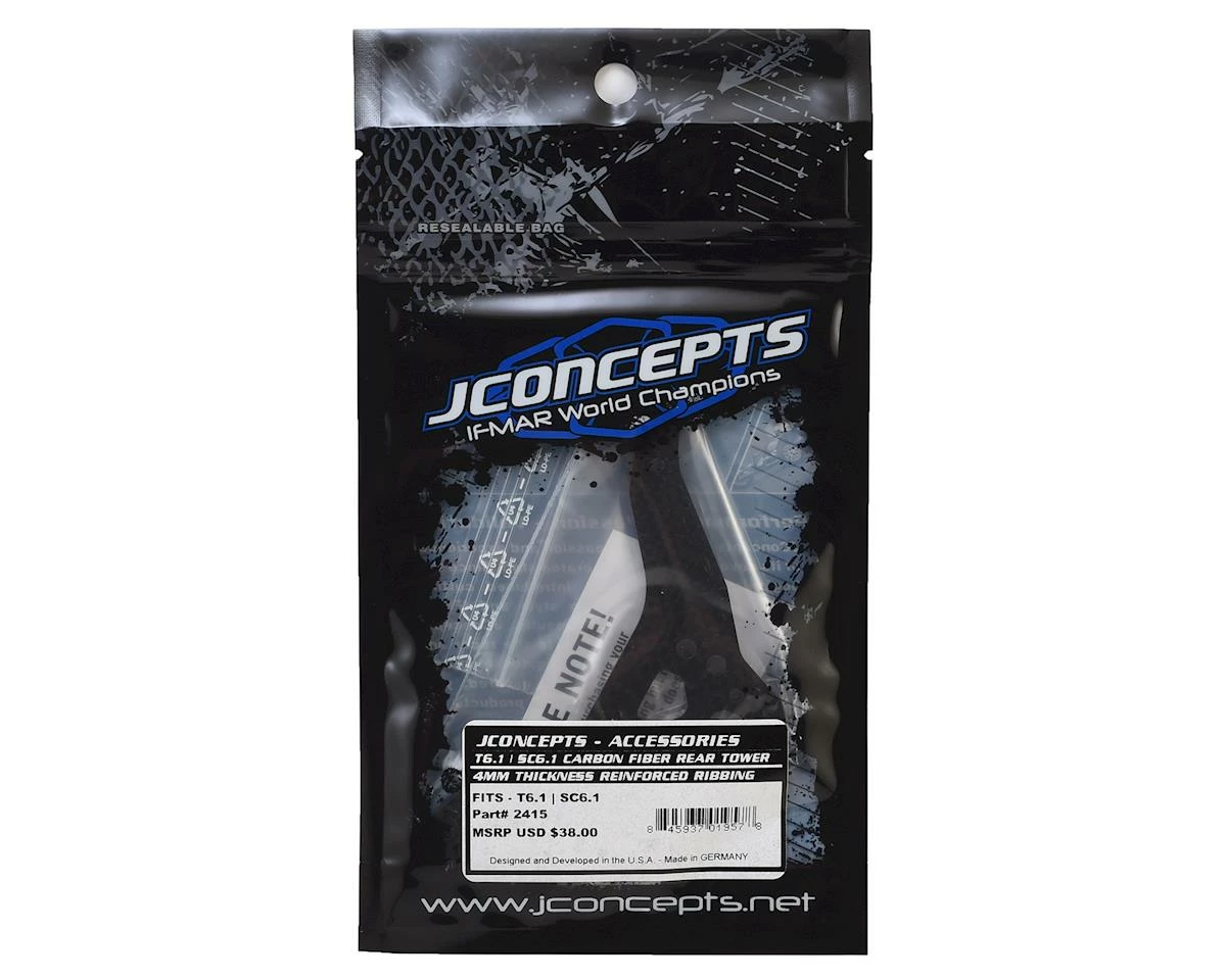 The JConcepts T6.1/SC6.1 Carbon Fiber Rear Shock Tower is machined from 4mm thick, genuine Carbon Fiber material to create a durable, light-weight shock tower option with milled sections to help maintain strength and minimize weight. The 3 standard (T6.1 / SC6.1) shock positions remain for quick and steady adjustments in the correct position for the standard length shocks.
