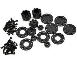 Each package contains 4 wheels, 12mm plastic hexes, wheel adapters to give the user a front and rear wheel offset and hardware to make the installation complete. The adapters attach with the included eight, 2.5x8mm screws to provide beefy security. In addition, each wheel includes a solid and open center cap which are attached with the included eight, 2.5x6mm socket head cap screws. Wheel profile, interior and exterior ribbing and spoke design were all areas of focus while creating the combination of durability, clearance, functionality and appearance. Molded in black with a face plating, being unique is worry free as practically any paint scheme can be matched to these exciting new wheels. The hassle-free and lightweight 1-piece design creates the ultimate work and play wheel for any competition.