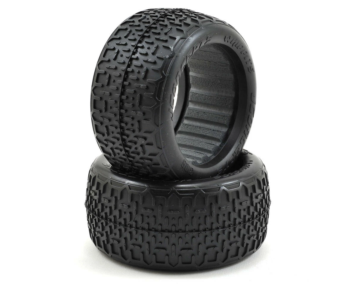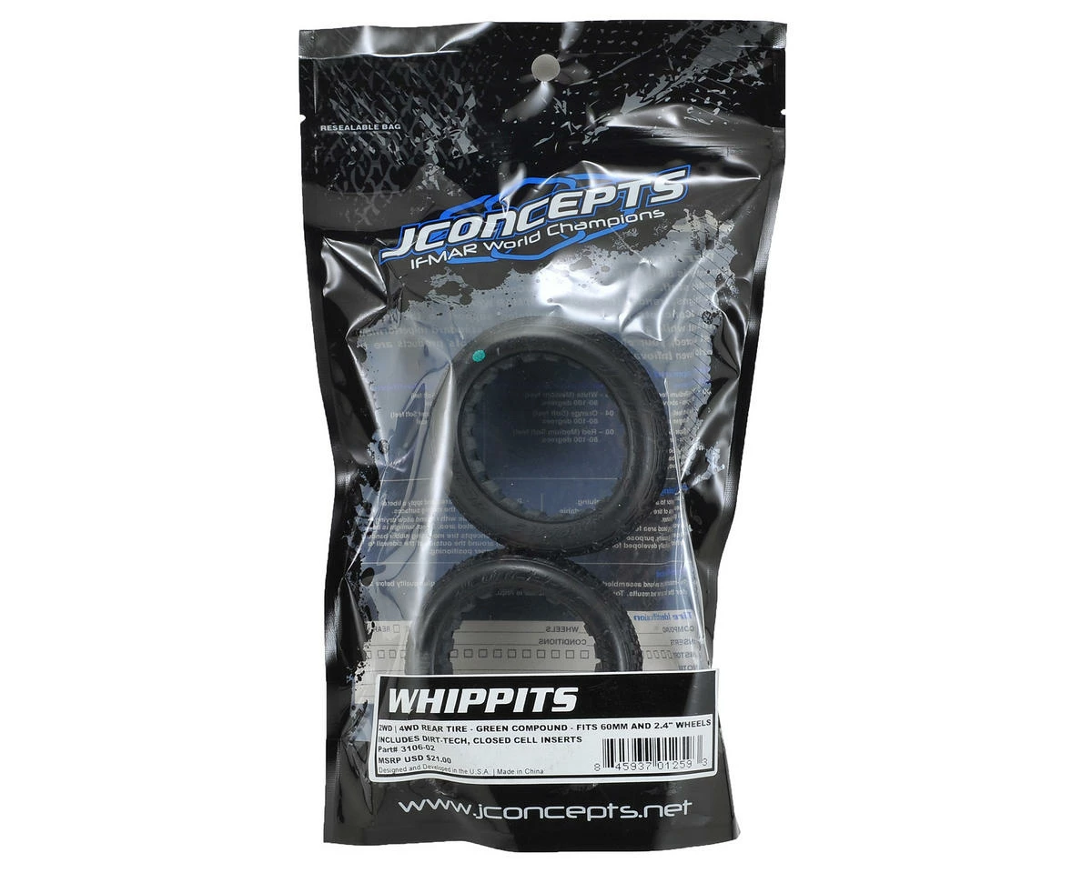 This is a pair of JConcepts Whippits 60mm Rear Buggy Tires. The outdoor racing scene has a new off-road tire, the Whippits. Built on the 60mm bead size carcass, the Whippits are fresh from the JConcepts design team. Starting with a sit-down meeting with racing legend Brian โDirtโ Kinwald, Jason Ruona went to work creating a beefier bar tire capable of conquering the outdoor blue groove, black groove and sugar type surfaces. The Whippits feature the 45 degree edging Kinwald asked for with light detail separating the pins as a noticeable top and bottom layer.