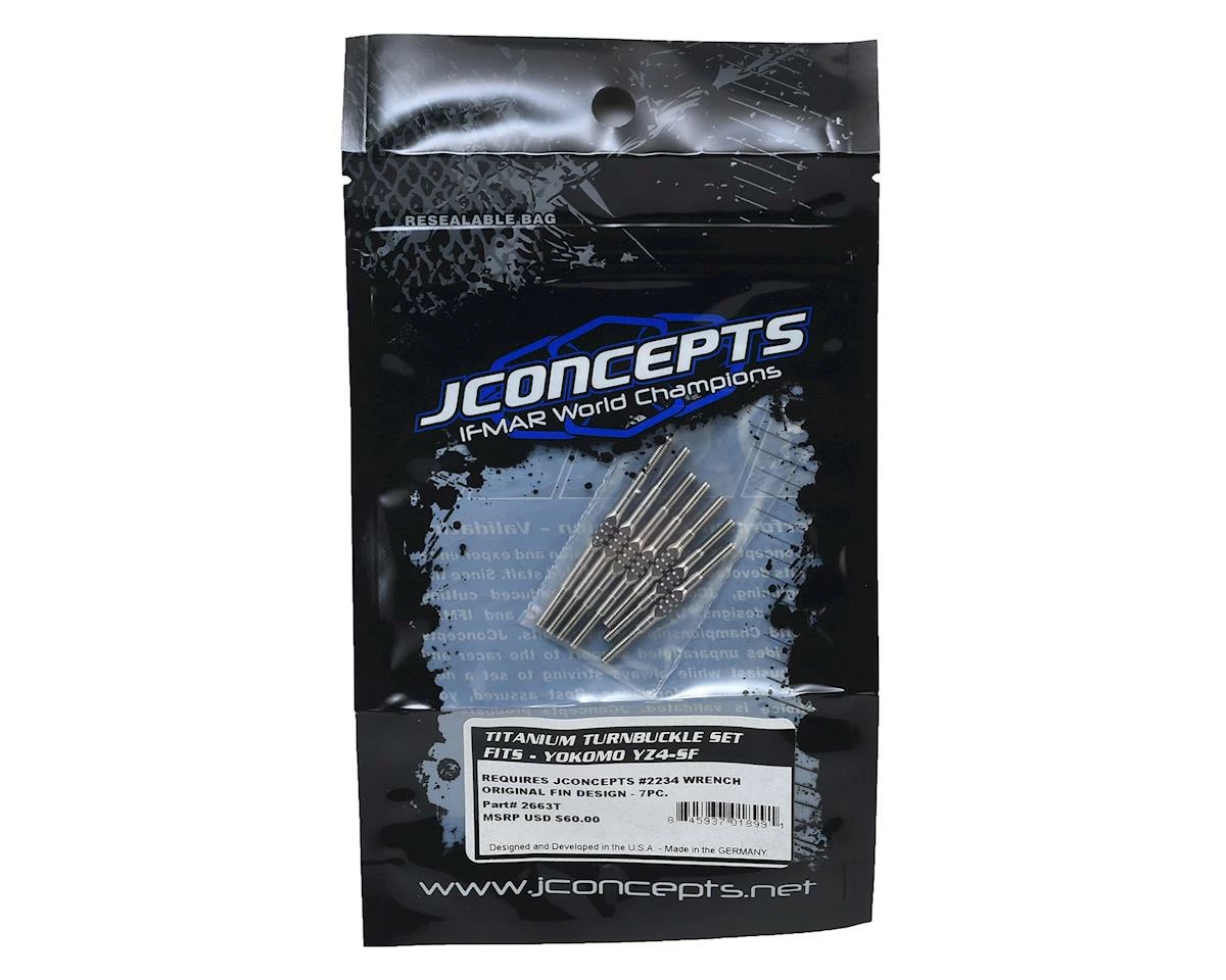 The JConcepts Yokomo YZ4-SF Fin Titanium Turnbuckle Set was designed specifically for style, durability and performance. The base of the shafts design is centered on a .143” titanium hex size which gradually tapers down into a 3mm thread base design which accepts the standard Yokomo ball-cup configuration. The focus of the styling surrounds the lengthened adjustment hex area and the “finned” cuts that rotate about the center. The Fin turnbuckles are lightweight and the original design brings out the glamour and quality that makes titanium one of the most sought after exotic materials in the world. The JConcepts turnbuckles are produced with left and right hand threads, the left conveniently marked for easy orientation.
